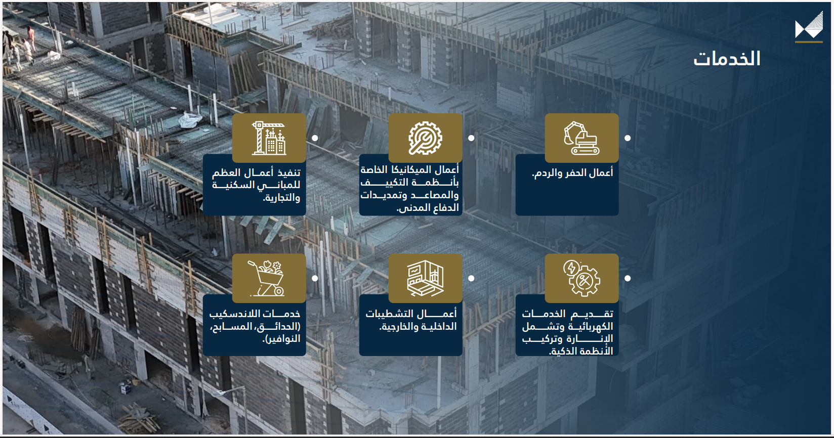 بفضل خبرتنا العريقة ومهاراتنا العالية، نقدّم خدمات إنشائية متكاملة تشمل: الإنشاءات الخرسانية والمعدنية، التشطيبات، أعمال التربة، وخدمة اللاندسكيب. نحن ملتزمون بالابتكار، ونتبنّى أحدث التقنيات والممارسات المستدامة لضمان نتائج متميزة.